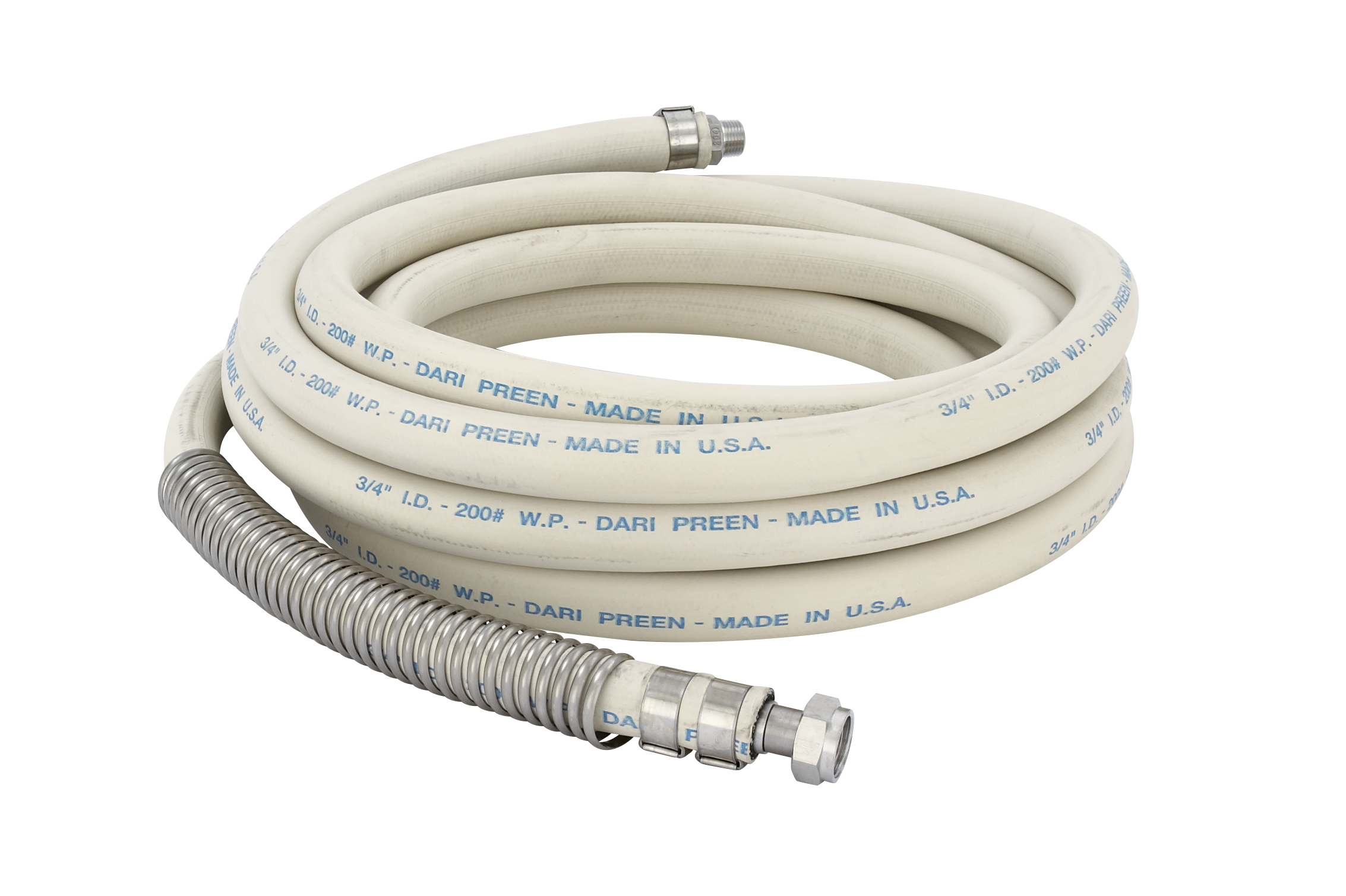 3/4" EPDM cream color cover, High temperature resistance 180°F (82°C) @ 200 PSI (13.7 Bar) 200°F (93°C) @ 50 PSI (3.4 Bar), Stainless steel couplings. Stainless steel spring protector, one end. 5 to 75 foot lengths, Special lengths available upon request