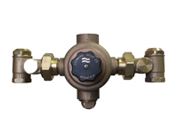 Thermostatic Water Mixing Valve with 3 GPM (11 l/min) minimum flow capacity, 1” inlets, 1-1/4” outlet (25mm x 32 mm), Integral combination checkstops with strainers, 125 PSI (8.6 BAR) maximum operating pressure, Copper encapsulated thermostatic assembly with Teflon coated stainless steel shuttle, Locking temperature regulating handle, Internal parts stainless steel, Integral wall support for easy mounting. Rough Bronze Finish