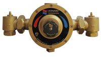 Thermostatic Water Mixing Valve with 5 GPM (19 l/min) minimum flow capacity, 1-1/4” inlets, 1-1/4” outlet (32mm x 32 mm), Integral combination checkstops with strainers, 125 PSI (8.6 BAR) maximum operating pressure, Copper encapsulated thermostatic assembly with Teflon coated shuttle, Locking temperature regulating handle set for 120°F(49°C), Top or bottom supply/outlet connections, Internal parts of stainless steel, Integral wall support for easy mounting. Rough Bronze Finish