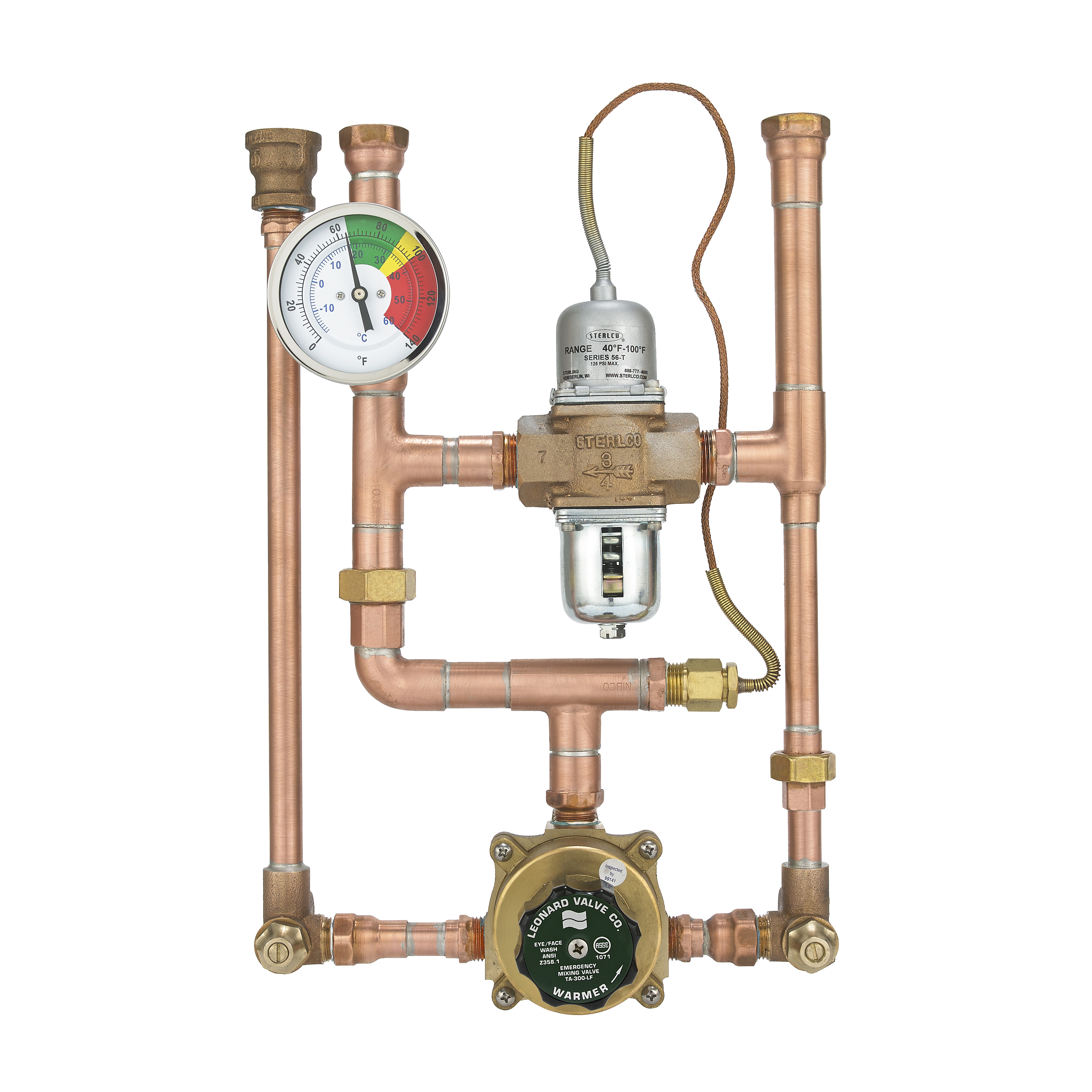 DURA-trol® solid bimetal thermostat directly linked to valve porting DURA-trol® is highly responsive and cannot be damaged by extremes in temperature Primary valve can be set to the correct temperature for the application. Locking temperature regulator to prevent accidental movement set for 85ºF (29ºC) Primary mixing valve will close down on failure of cold water supply. Primary Mixing Valve with special internal cold water bypass capable of 4 GPM (15 l/min) @ 30 PSI (2.1 Bar) upon failure of hot water supply. Adjustable high temperature limit stop set for 90ºF (32ºC) Dial thermometer (range 0 to 140°F, -10 to 60°C) Straight checkstops on inlets Secondary Thermostatic Control factory locked @ 90°F, 32°C(adjustable from 40°F to 100°F, 4°C to 32°C) to allow cold water to enter the outlet side of the primary mixing valve. Rough bronze finish Hot Water Requirements
