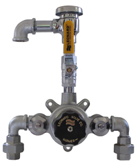 Thermostatic Water Mixing Valve with 2.5 GPM (9.5 l/min) flow capacity, Integral combination checkstops with wall support, 125 PSI (8.6 BAR) maximum perating pressure, Copper encapsulated thermostatic assembly with Teflon coated stainless steel shuttle, Locking temperature regulating handle, Internal parts of brass, bronze and stainless steel, Outlet volume control / shutoff, vacuum breaker, Factory assembled and tested