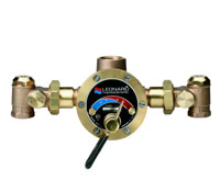 DURA-trol® solid bimetal thermostat directly linked to valve porting to control the intake of steam ( or hot ) and cold water. DURA-trol® is highly responsive and cannot be damaged by extremes in temperatures. Integral combination checkstops with all stainless steel internal parts. Color coded scale: Cold to Hot, high temperature limit stop Heat resistant temperature adjusting lever Integral wall support