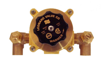 Thermostatic water mixing valve, DURA-trol® solid bimetal thermostat directly linked to valve porting to control the intake of hot and cold water and compensate for supply temperature or pressure fluctuations. DURA-trol® is highly responsive and cannot be damaged by extremes in temperature. 1/2” Sweat inlets and outlet, 0.5 GPM (1.9 l/m) minimum flow capacity. Integral combination checkstops, Internal parts of lead free bronze, lead free brass, and stainless steel, Integral wall support, Temperature selector handle, HOT-COLD with directional indicators, Maximum operating pressure 125 PSI (860 KPA), Adjustable high temperature limit stop set for 110º F (49º C), Locking temperature adjustment knob
