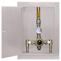Thermostatic water mixing valve, Copper encapsulated thermostatic assembly with Teflon coated shuttle Lead free (ECO-MIX ™) Combination checkstops, unions on inlets, wall support Locking temperature regulating handle. Tempered outlet ball valves, Color coded dial thermometer (0 to140ºF, -10º to 60ºC). Recessed Stainless Steel cabinet, with door, left hand hinge and flange, cylinder lock, Rough Bronze finish. Bottom inlets, top outlet Factory assembled and tested