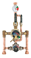 Provide factory assembled and tested large TYPE TM thermostatic water mixing valve, small TYPE TM valve, DURA-trol® solid bi-metal thermostat (directly linked to valve porting to control the intake of hot and cold water and compensate for supply temperature or pressure fluctuations) with Ten Year Limited Warranty, color coded dials (HOT-COLD with directional indicators), locking temperature regulator handles, adjustable limit stops set for 120°F (49°C), integral hot and cold supply checkstops, outlet ball valve shutoffs and color coded dial thermometer, inlet piping manifold, factory preassembled and tested, rough bronze finish System shall provide full time standby service should one mixing valve require maintenance and shall be piped according to Leonard’s required piping method.