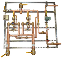 Large thermostatic water mixing valve with DURA-trol solid bimetal thermostat, adjustable high temperature limit stop, color-coded dial, locking temperature regulator, inlet union angle strainer checkstops. Full port ball valve, pressure gauge on mixed water outlet piping of large mixing valve. Small thermostatic water mixing valve, adjustable high temperature limit stop, color-coded dial, integral checkstops on inlets. Full port ball valve on outlet of small mixing valve. Dial thermometer and pressure gauge on mixed water outlet of the system. Outlet Test Connection with ball valve and ¾” hose connection with cap. Full port ball valve mounted downstream of test connection. Inlet piping manifold with full port ball valves and dial thermometers on hot and cold supply inlets. Return piping, ¾”, with aquastat, circulator, dial thermometer, balancing valve, and check valve. System mounted on strut, Factory pre-assembled and tested. All electrical connections to be completed by Electrical Contractor