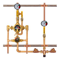 Large Type TM Thermostatic water mixing valve, adjustable high temperature limit stop*, inlet checkstops, wall support, outlet ball valve. Small Type TM Thermostatic water mixing valve, adjustable high temperature limit stop, integral checkstops, outlet ball valve, Inlet manifold piping. Dura-trol® solid bimetal thermostat directly linked to valve porting to control the intake of hot and cold water and compensate for supply temperature or pressure fluctuations. Dura-trol® is highly responsive and cannot be damaged by extremes in temperature. Adjustable high temperature limit stop* set for 120ºF (49ºC) Combination checkstops, unions, strainers on inlets wall support, plastic handle. Dial thermometer and pressure gauge on outlet, ¾” Return loop with dial thermometer, Ball valve, ¾” Leonard ARV automatic return valve, parafin-based. Check valves on either side of ARV, Complete unit mounted on heavy duty strut, for ease of installation. Valve assembly rough bronze finish. Factory assembled and tested