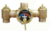 Thermostatic water mixing valve, DURA-trol® solid bimetal thermostat directly linked to valve porting to control the intake of hot and cold water and compensate for supply temperature or pressure fluctuations. DURA-trol® is highly responsive and cannot be damaged by extremes in temperature. Internal parts of bronze, brass, and stainless steel, Integral wall support, cast lever handle, combination checkstops. Color-coded dial, HOT-COLD with Directional indicators. Maximum operating pressure 125 PSI (860 KPA). Note: The operating outlet temperature range of these valves is outside the normal operating range of a Domestic Hot Water Distribution Valve and therefore they are more suitable for Process Temperature Control applications. Please see Leonard’s complete line of ASSE 1017 Certified Valves for Domestic Hot Water Applications. Valve is Lead Free Compliant